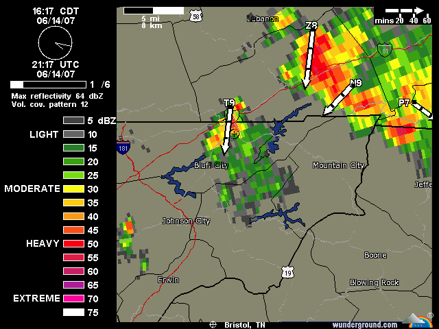 A pair of strong thunderstorms are working their way toward Carter and Johnson Counties. Be alert for gusty winds, small hail, continuous cloud-to-ground lightning, and heavy rainfall. These storms will move off to the SSW at 5-10 MPH.